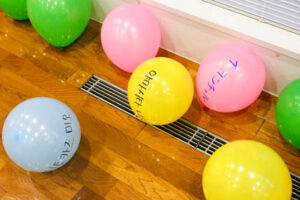 続いて、韓国の生徒1人と、日本の生徒2~3名でチームをつくり、メンバーの名前がかかれた風船を見つけてくるゲームを行いました。