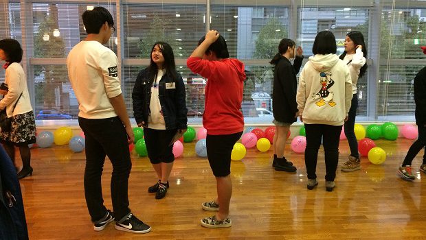 続いて、韓国の生徒1人と、日本の生徒2~3名でチームをつくり、メンバーの名前がかかれた風船を見つけてくるゲームを行いました。