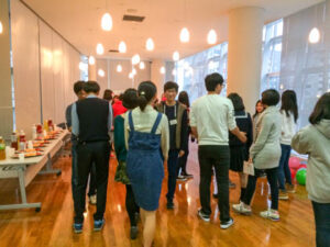 最後に、韓国の生徒2人~3人と日本の生徒で8人程度のグループを作り、自己紹介したあと、班の仲間と自由におしゃべりする時間をつくりました。途中、毎週文化院で韓国語を学んでいる世宗学堂の生徒が院内を案内しながら交流できる時間も設けました。ホストファミリーの生徒や保護者にとっては、自分たちがホストしている韓国の高校生以外の多くの韓国高校生との出会いの場となったほか、韓国文化を体験できる機会となりました。