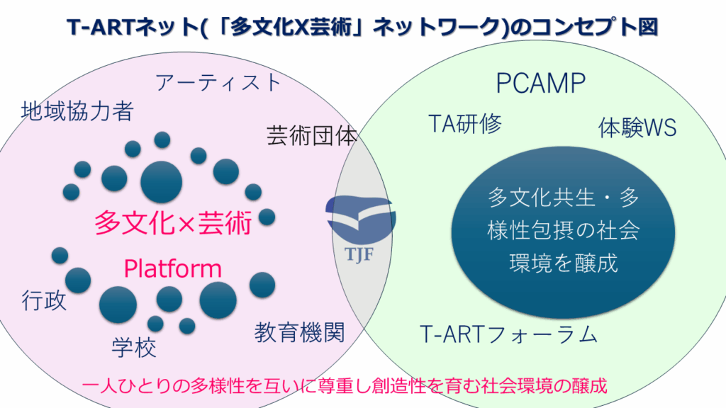 アーティストをはじめ、各地域の文化・芸術団体、多文化共生に取り組む皆様のご協力により、PCAMPをはじめとするT-ART事業は、2017年より8年の積み重ねを経て、広がりと深化を遂げています。PCAMPに加え、体験ワークショップやティーチングアーティスト(TA)研修などを各地で展開するなかで、芸術の力を活かした多文化共生や多様性包摂社会づくりの可能性についてより一層確信するようになりました。 本事業の持続とさらなる発展を図るために、T-ART事業を共に育ててくださったアーティストの皆様をコアメンバーとするT-ARTネットを立上げることにしました。