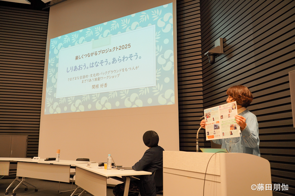 報告では、VECの活動や演劇ワークショップを始めた経緯、ワークショップの内容について、写真と映像で共有していただきました。ワークショップの中でスカーフやロープを活用した表現、名前とポーズをセットにした自己紹介、「はい」と「いいえ」だけを使った演劇づくり、音楽を使ったアクティビティなど、参加者が楽しそうに取り組んでいる様子や参加者の声が紹介されました。同プロジェクトの今後の展望として、ワークショップの継続と成果発表を開催していくこと、そして、まだ日本語を学び始めたばかりの方々も参加できるプログラムにしていきたいと話されていました。ワークショップには毎回、東京女子大学で日本語教育を学ぶ学生さんがボランティアで参加していて、ダイナミックな交流と学び、実践の場にデザインされていました。