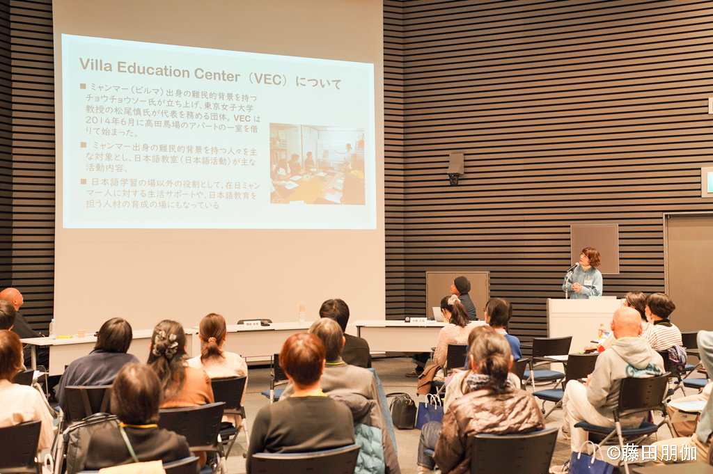 俳優・ファシリテーターの関根好香氏から「VECの活動について」ご報告いただきました。活動のタイトルは「しりあおう・はなそう・あらわそう」です。VECとは、東京女子大学の松尾慎教授が中心になって2014年に立ち上げた団体で、ミャンマー出身の難民を主な対象にした日本語教室や生活サポートを中心に活動しています。
