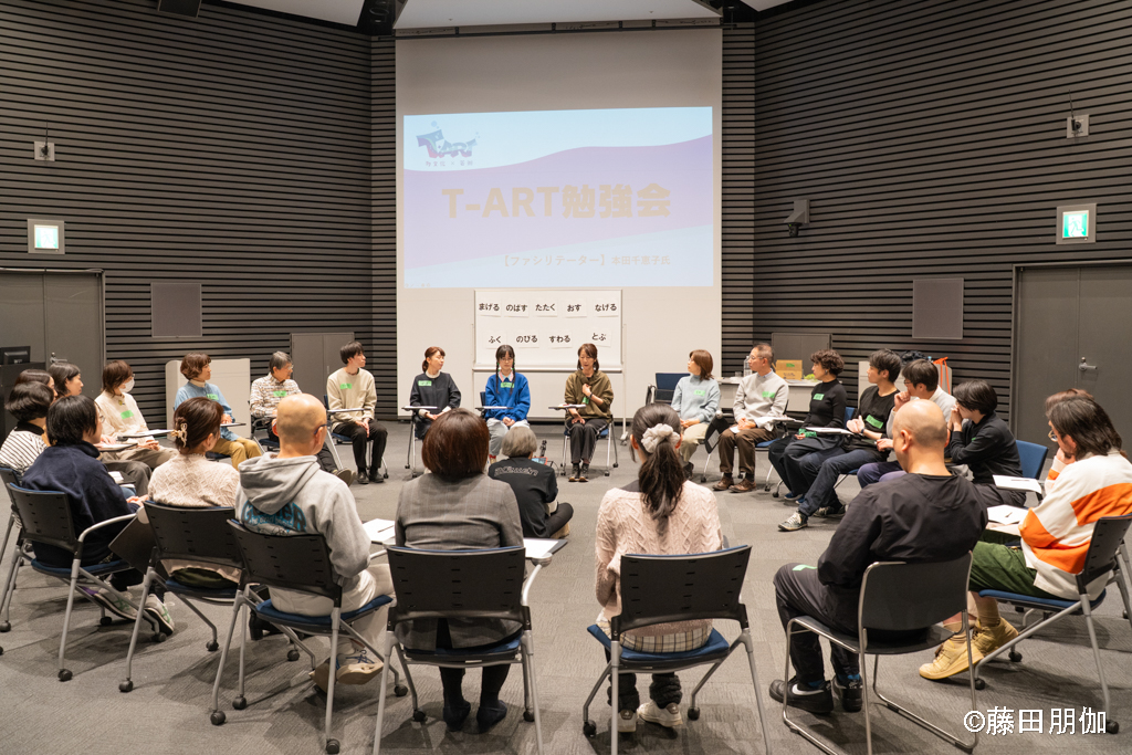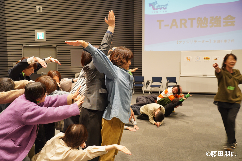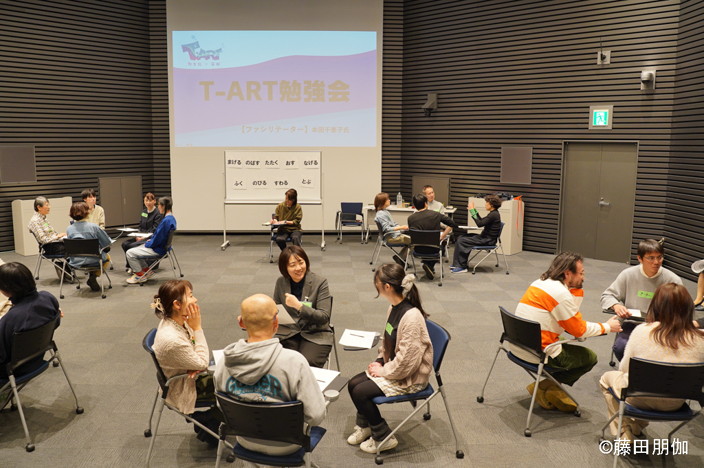 報告会に参加した方々の希望者を対象に午後はT-ART勉強会を開催しました。ファシリテーターは長年外国につながる方々を対象とした演劇ワークショップでファシリテーターを務めてきた俳優の本田知恵子氏にお願いしました。アーティストや演劇ワークに関心を持つ方々、報告会登壇者・見学者を含め、約30名が参加しました。