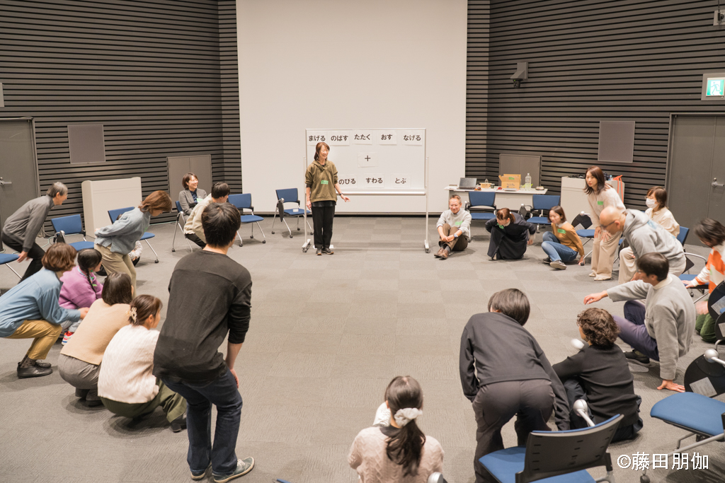 本田氏は、対象者の日本語の習熟度を考慮した体験プログラムを組み、「だるまさんが転んだ」ゲームや絵、ひらがななどを使ったワークを参加者に体験していただきました。絵の情報を身体で表現してみる、ひらがらを身体で形作る、一人ひとりがひらがなになり切って「ことば」になる仲間を探す・・・。日本語ネーティブがほとんどの参加者でも、この新しい「ことば」と「身体」と関係性を楽しんでいました。そして、ワークを体験してもらいながら、各ワークの狙いや効果、アレンジのアイディアが本田氏から紹介され、ファシリテーションの学びにつなげていきました。