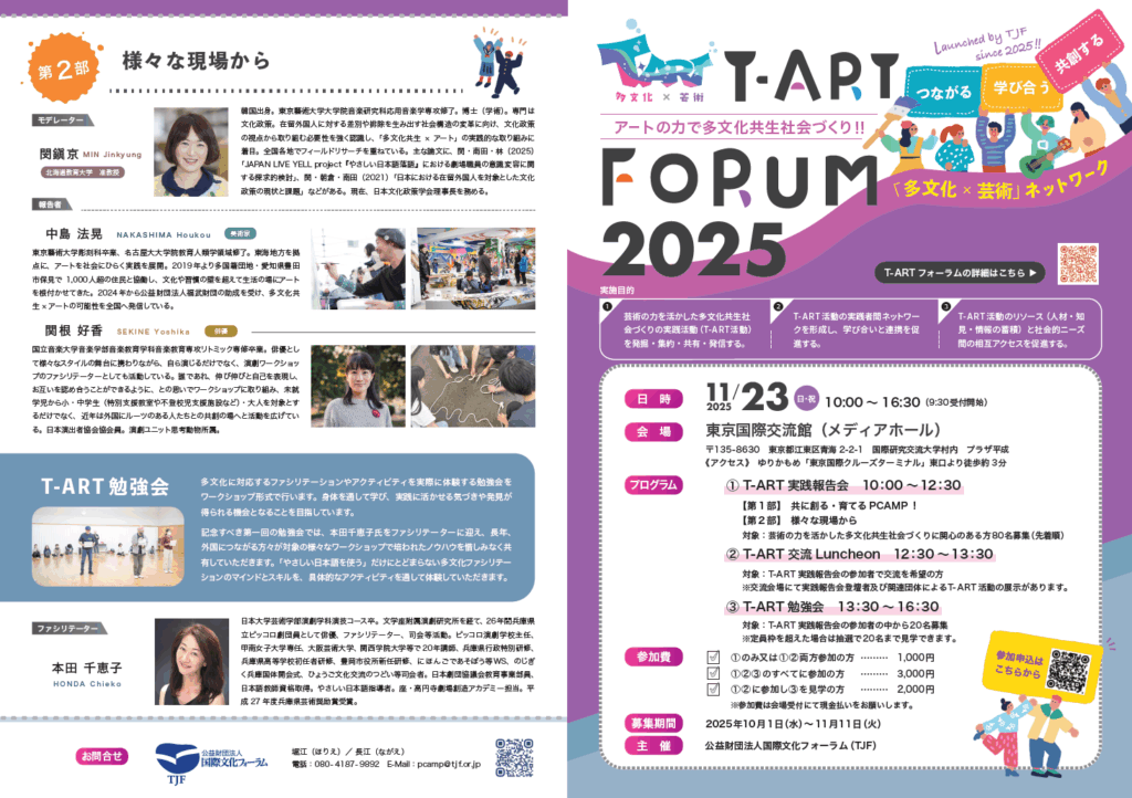 TJFは2025年11月23日、第1回となる「T-ARTフォーラム2025」を東京国際交流館(メディアホール)にて開催しました。「T-ART」とは、多様な中高生年代を対象とする多言語・多文化交流「パフォーマンス合宿(PCAMP)」をはじめ、TJFが「多文化×芸術」をコンセプトに実施している一連の事業の愛称です。TはTabunka(多文化)、Teaching Artist、TJFの頭文字から取りました。
