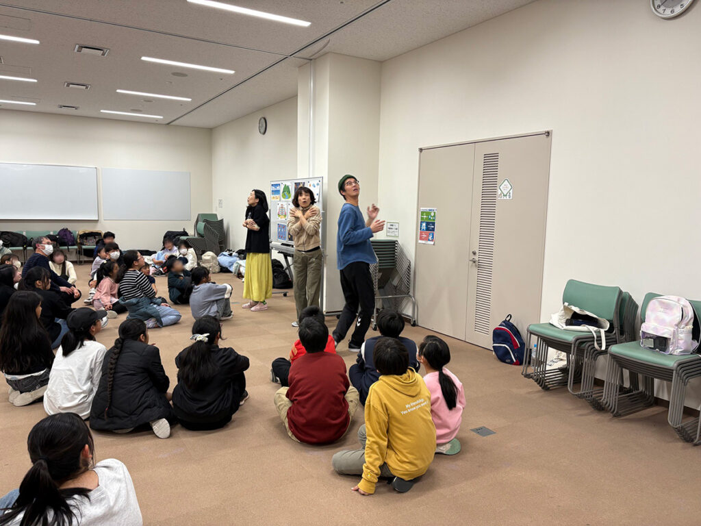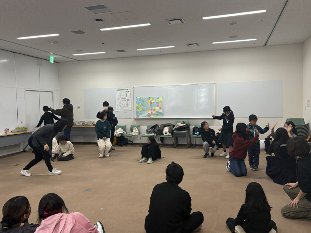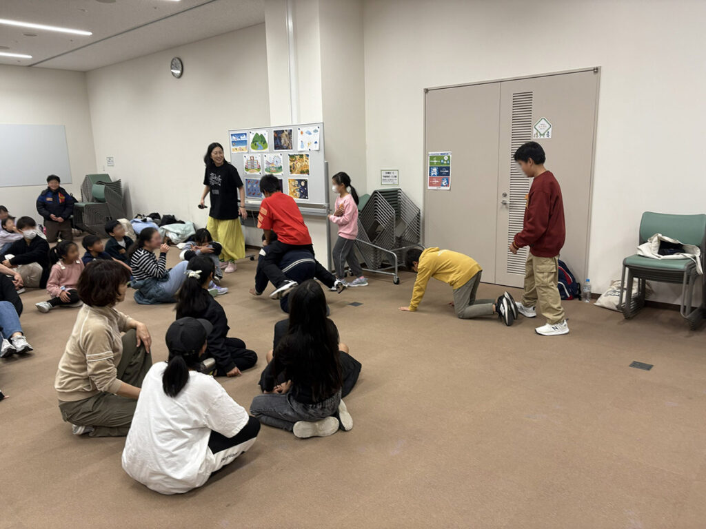 参加者は創作時間を経て発表。乗り物というテーマを選んだチームは車や運転手、信号機を身体で表現したり、学校を選んだチームは寝ている生徒を登場させたり、海というテーマを選んだチームは愉快なカニがハサミを動かしながら右へ左へと走ったり、動物園でサルが喧嘩をしたり、山というテーマを立体的に表現したチームもいました。恥ずかしがりながらも表現を楽しんでくれた子どもたちは、他のチームの発表を見て、正解を当てようとたくさんの手が上がりました。