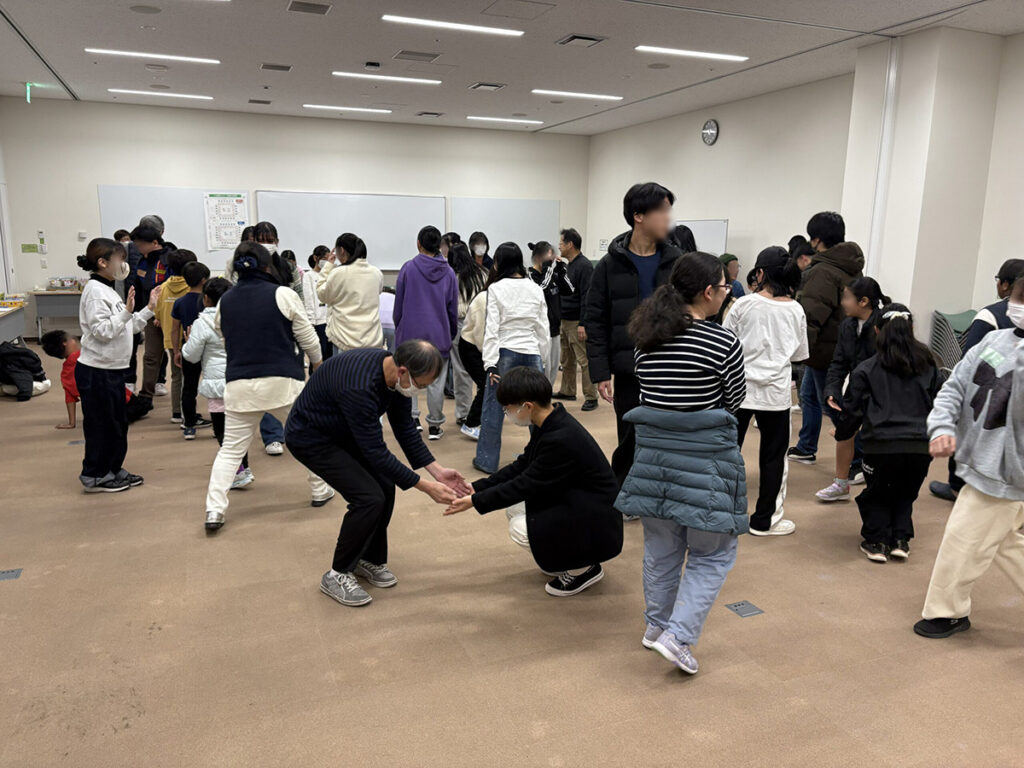 次に、音楽に合わせて歩いたり止まったりするストップ&ゴーをしました。目が合った人とハイタッチ、止まった時にポーズをとる、スローモーションで歩く、早く歩く、隣の人と歩幅やスピードを合わせて歩く、寒い雪や暑い海、宇宙の中にいるつもりで歩くなど、イメージを身体で表現することを経験していきました。
