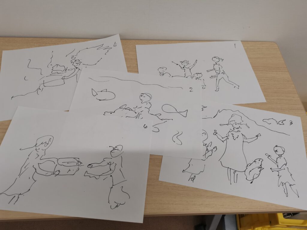 5人のグループに分かれて、共通に知っている昔話を選びます。そのストーリーを5つのシーンで表せるように5枚の絵コンテを書きます。5人全員でシーン毎に1枚の写真になるように身体で表現します。各シーンの中で一回だけ声が使えます。そうしてできた作品を発表し、なんの物語かを見ている人たちが当てていくというワークです。