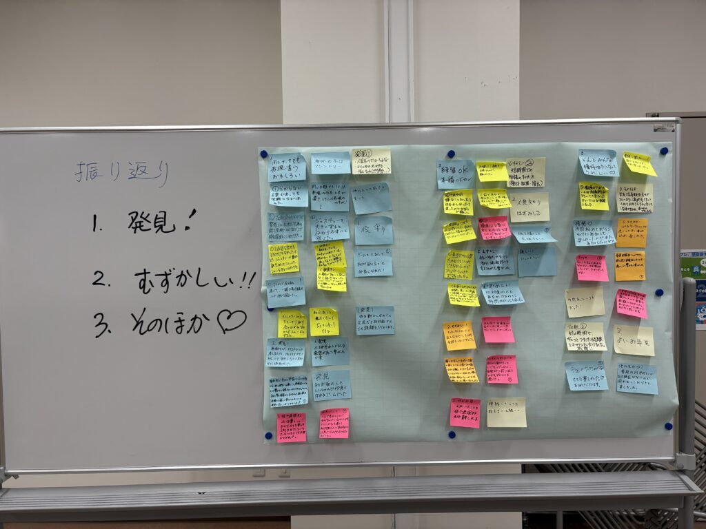 振返りでは、意見が出しやすいように、3つの質問(発見したこと、難しかったこと、その他)についてそれぞれ付箋に書いてから、5人のグループ内で共有し、そのあとグループ内で特に印象に残った感想を発表してもらいました。そのあと、付箋を模造紙に貼ってもらい、記録として残しました。その中から感想をいくつか抜粋して紹介します。