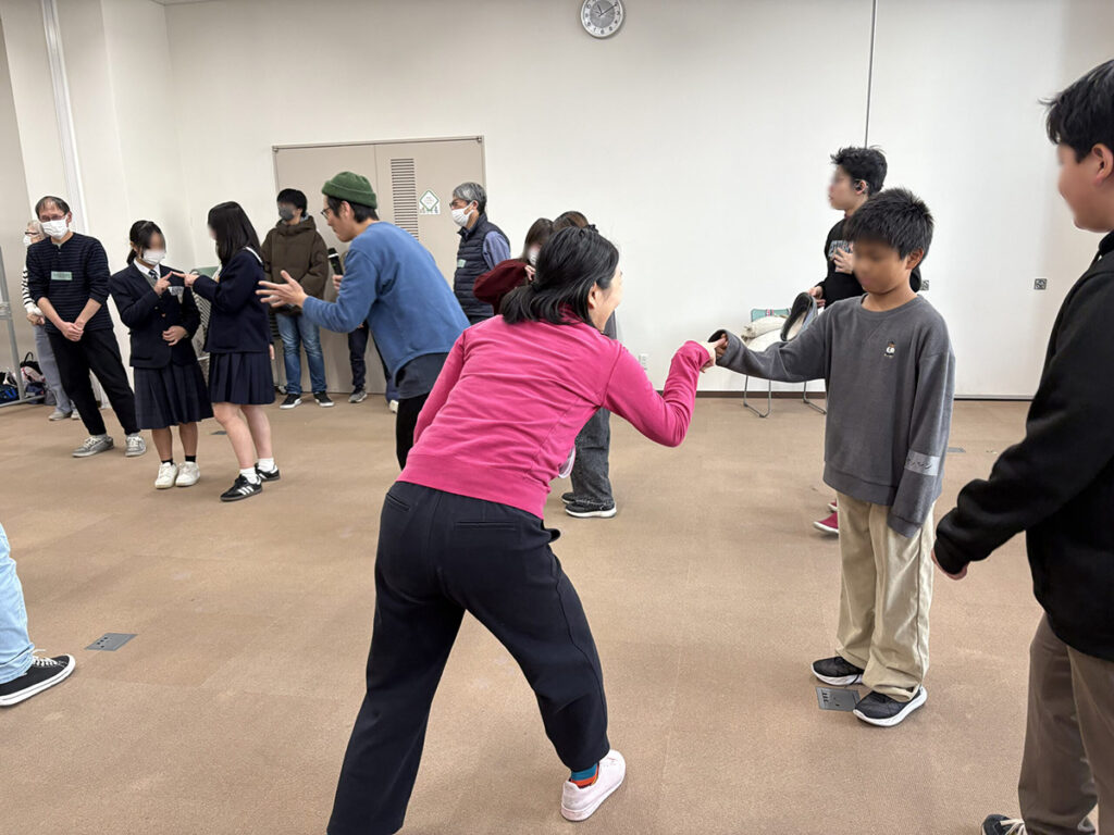 1日目(12月26日)のワークショップ1では初参加ということで身体表現中心のプログラムを組みましたが、2日目(12月27日)となるワークショップ3では、「ことばと身体で伝える・受け取る」をテーマに演劇ワークを中心としたプログラムを実施しました。1日目午後のワークショップ2でさまざまな演劇ワークを経験したボランティアたちも、小中学生をサポートしながら新しい表現のワークを楽しみました。