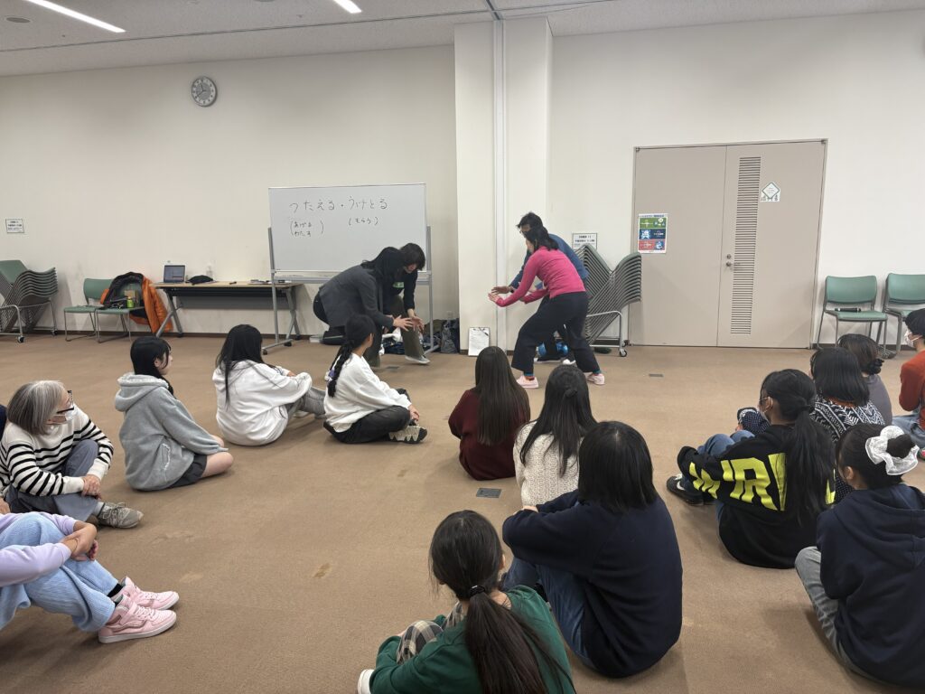 はじめに名前を使ったコール&レスポンスをしまた。参加者全員が一つ大きな円になり、一人ひとりが名前を言いながらポーズをします。その名前を全員で言いながらポーズを真似るというワークです。みんなが名前を呼んでくれて真似てくれることで「受け入れられた」という気持ちになり、安心して参加できるようになっていきます。中には恥ずかしくて声が小さかったり、なかなかポーズを付けられなかったりする子どももいましたが、ファシリテーターは一人ひとりのそばに行き、ていねいに聞き取り、それを大きな声でリピートしてみんなに伝えながらゲームを進めていきました。