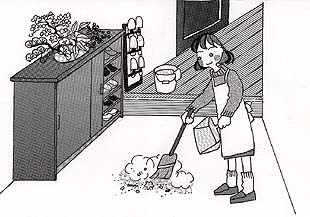 Year-end / New Year PreparationsOOsooji For the household, " year-end cleaning " is a regular and major event, for tradition dictates that a house should be made immaculate in preparation for greeting the New Year. So widely established is this custom that sales of cleaning supplies and television commercials for cleaning equipment invariably increase during these busy weeks. Special care is taken to clean parts of the house not ordinarily given much attention throughout the year, such as ceilings, ventilation fans, woodwork, and corners behind furniture. In some families, the chores are divided up among family members and the furniture is moved out to wipe the walls and floors ; windows are washed and shined, the paper on the shooji panels is changed, and the family car is washed. When the cleaning is done and house has been tidied, the entranceway to the house is scrubbed and sprinkled with water, and special New Year's festoons are set out in the entrance hall and main rooms elsewhere in the house, and even attached to the car. Oosooji is naturally the best way to get rid of the dust and dirt that has accumulated over the past year, but is also a helpful occasion to take account of those things left undone and organize one's affairs. That process makes it easier to get a fresh start in the New Year. | |