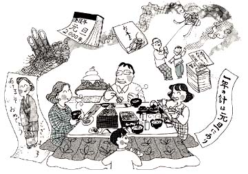 | Soba, or buckwheat noodles, customarily eaten on New Year's Eve, are called " year-crossing soba. " There are various theories about the origin of this custom, but essentially it is associated with the prayer for a happy and prosperous New Year. Every household has a different custom: some boil and serve soba at home, others take time out of their busy preparations to go out to eat at a nearby soba shop, and still others order delivery of prepared soba from a local shop. New Year's Eve is the soba shop's busiest time of year. | ![]() Brother: "Why do we eat soba at New Year's?" Mother: "They say so it's you'll live long like a noodle!" |